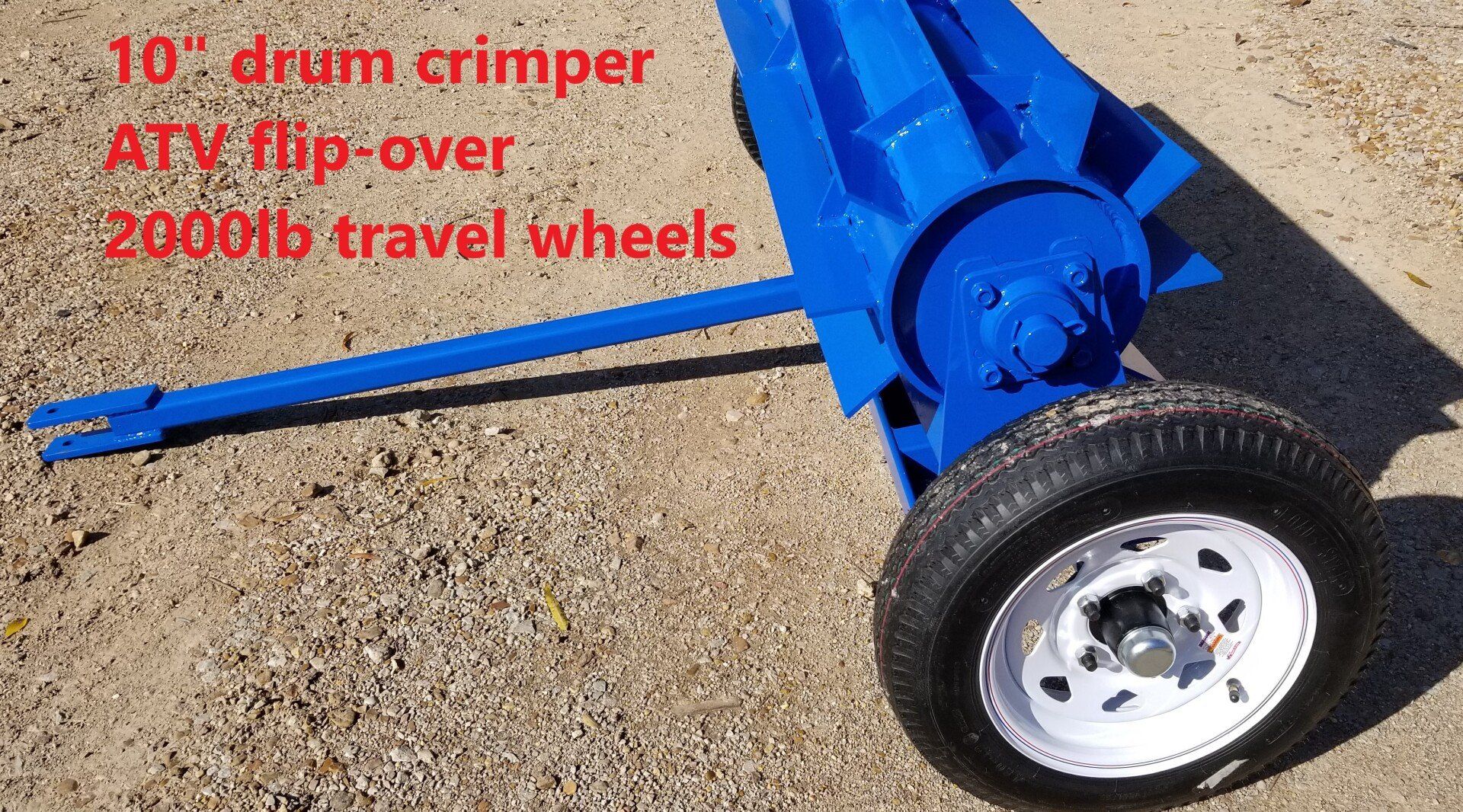 Our 10” drum Roller-Crimpers work well for smaller tractors & ATV/UTVs. Ranging from 3’ – 7’, they ride on a 1 3/4" solid steel axle that runs the full length of the drum. Frame is 2 ½” angle iron that is 3/8” thick with extra cross-bracing and laser-cut bearing plates to ensure smooth operation and durability. Quality grease-able bearings & true-pulling frame greatly reduce the drag/load on your ATV/UTV. Available with drop-pin or ball hitch tongue.