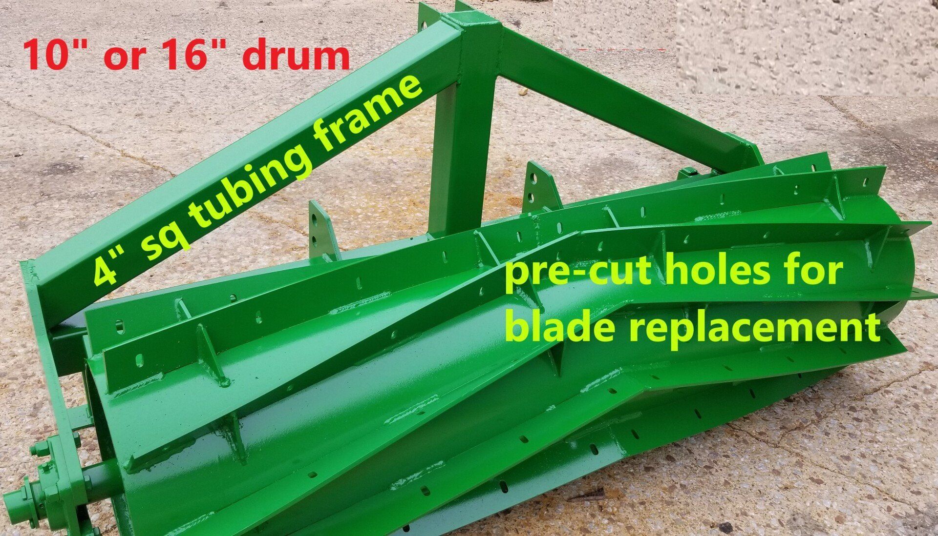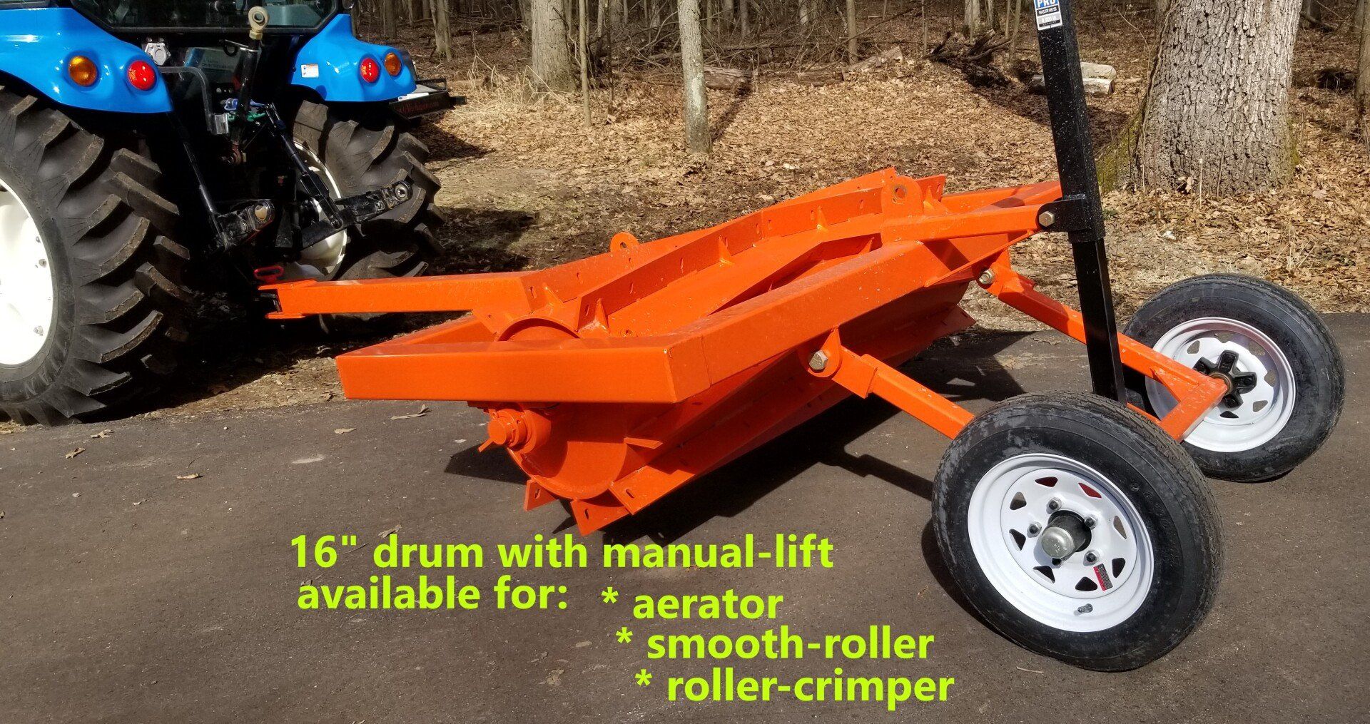 Our 16” drum Roller-Crimpers are built on a 4x4” square, or 3x5” rectangular tubing frame. They ride on a heavy 2" solid steel axle & quality grease-able bearings. The extra cross-bracing and laser-cut bearing plates ensure smooth operation and durably. Blades are reinforced with extra bracing.